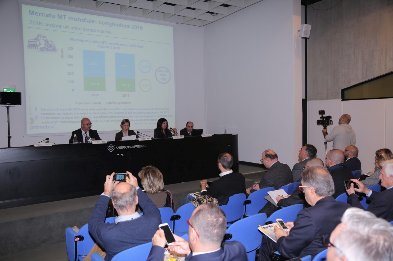 Katy Mandurino, journalist of Il Sole 24 Ore and moderator of the event, introduces the outlook on the world earth moving machinery market
