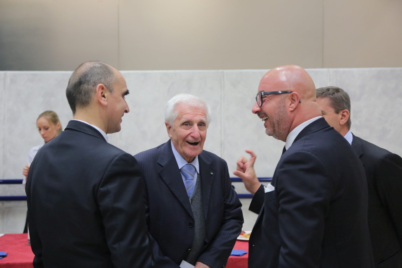 Luciano Rizzi, manager of Veronafiere, with Cav. Amilcare Merlo, founder of Merlo, and Francesco Zerbinati, editorial director of Meccanizzazione in Miniatura e TinA - Tecnologie in Agricoltura